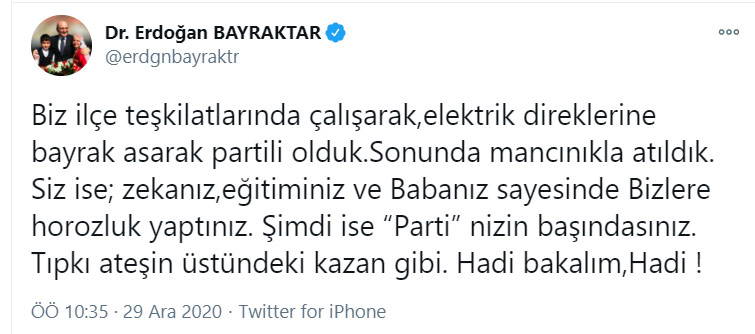 AKP’den “mancınıkla atıldığını" belirten Bayraktar, isim vermeden "Siz ise; zekanız, eğitiminiz ve Babanız sayesinde Bizlere horozluk yaptınız" diye yazdı.