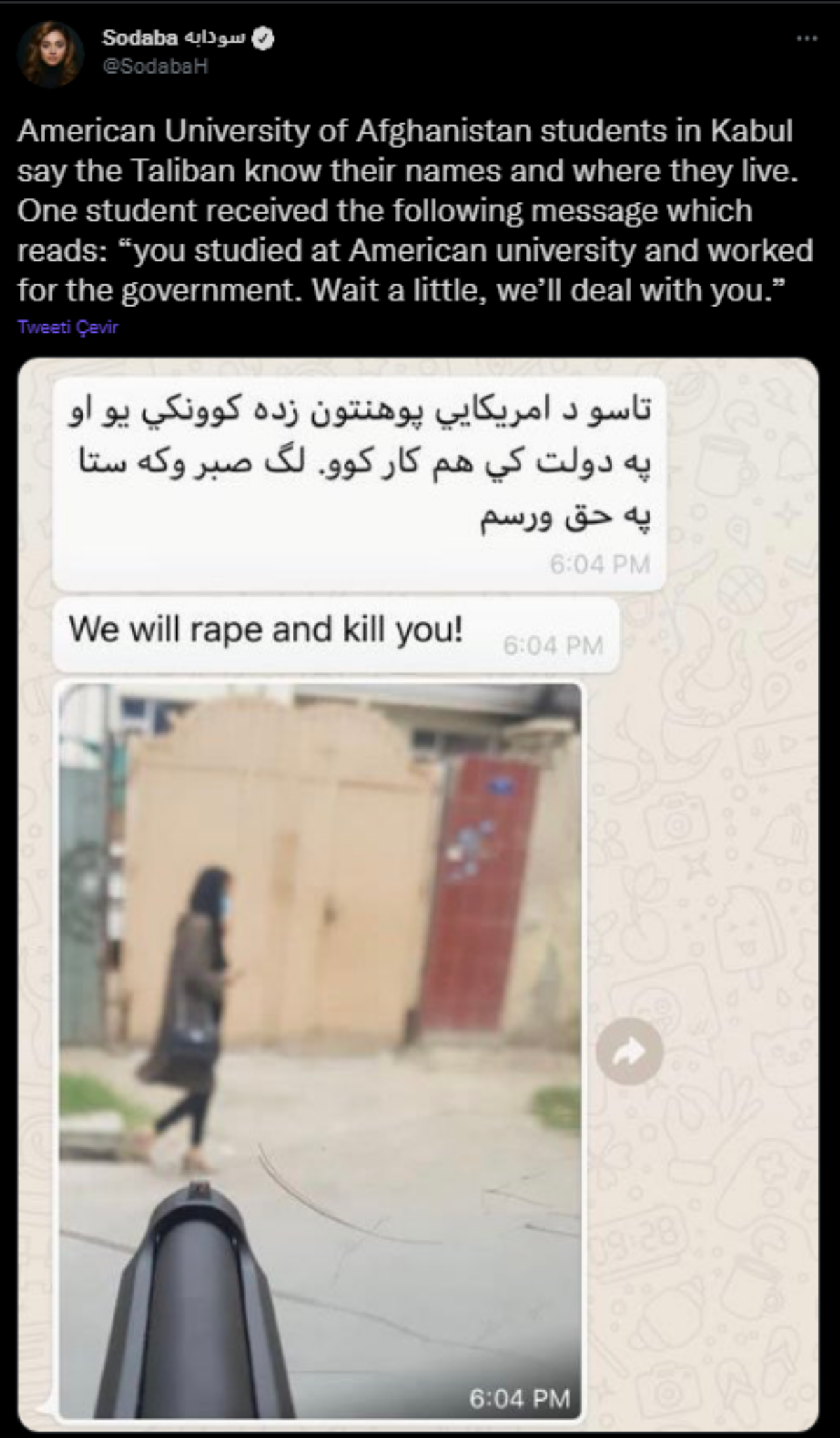 Bir öğrenciye gönderilen mesajı paylaşan Haidare, söz konusu mesajda, "Kabil'deki Afganistan Amerikan Üniversitesi öğrencileri, Taliban'ın isimlerini ve nerede yaşadıklarını bildiğini söylüyor. Bir öğrenci şu mesajı aldı: 'Amerikan üniversitesinde okudunuz ve hükümet için çalıştınız. Biraz bekle, seninle ilgileneceğiz'" ifadelerini kullandı.