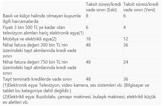 Bazı harcamalarda kredi kartlarında taksitlendirme süreleri ve taşıt alımlarında kredi vade sınırları şöyle: