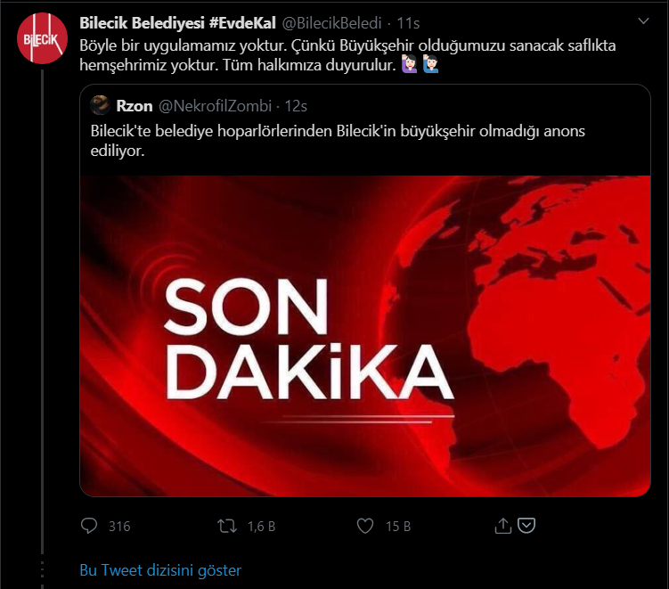 Belediye tarafından yapılan paylaşımlarda şu ifadeler yer aldı: "Böyle bir uygulamamız yoktur. Çünkü büyükşehir olduğumuzu sanacak saflıkta hemşehrimiz yoktur. Tüm halkımıza duyurulur. 31 il için verilen hafta sonu sokağa çıkma yasağı, bu gece o şehirlerdeki vatandaşlarımızı sokağa döktü. Söz veriyoruz, olur da sokağa çıkma yasağı gelirse sizi ekmeksiz bırakmayız. Merak etmeyin lütfen. Evde kal Bilecik onlara uyma! Madem geldiniz, eğlendiniz, güldünüz. Gelmişken bari takibe alın da işe yarasın.”