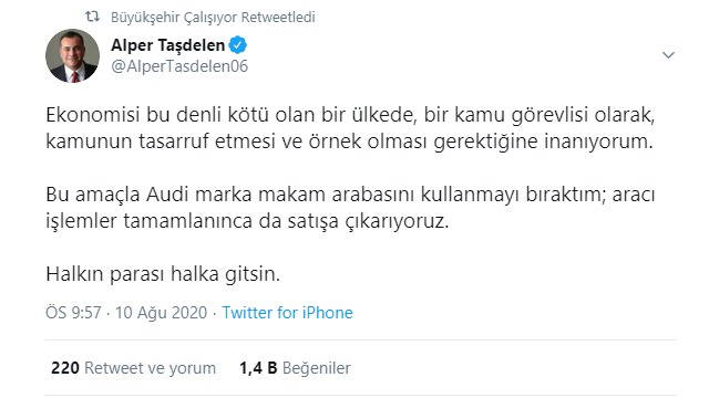 "Ekonomisi bu denli kötü olan bir ülkede, bir kamu görevlisi olarak, kamunun tasarruf etmesi ve örnek olması gerektiğine inanıyorum. Bu amaçla Audi marka makam arabasını kullanmayı bıraktım; aracı işlemler tamamlanınca da satışa çıkarıyoruz. Halkın parası halka gitsin."