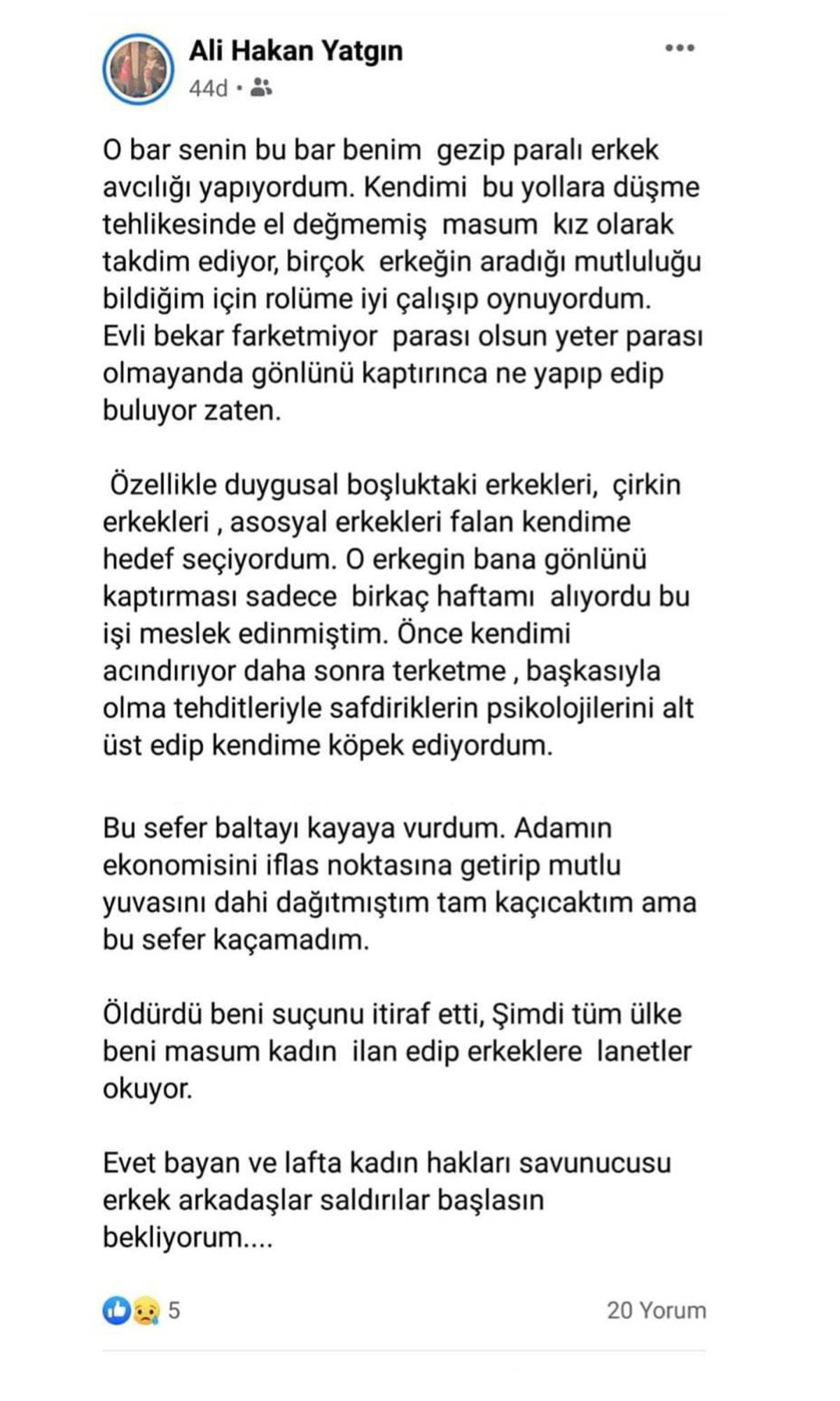 'O bar senin bu bar benim gezip paralı erkek avcılığı yapıyordum. Kendimi bu yollara düşme tehlikesinde el değmemiş masum kız olarak takdim ediyor, birçok erkeğin aradığı mutluluğu bildiğim için rolüme iyi çalışıp oynuyordum. Evli bekar fark etmiyor parası olsun yeter parası olmayan da gönlünü kaptırınca ne yapıp ne edip buluyor zaten. Özellikle duygusal boşluktaki erkekleri, çirkin erkekleri, asosyal erkekleri falan kendime hedef seçiyordum. O erkeğin bana gönlünü kaptırması sadece birkaç haftamı alıyordu. Bu işi meslek edinmiştim. Önce kendimi acındırıyor daha sonra terk etme, başkasıyla olma tehditleriyle saftiriklerin psikolojilerini alt üst edip kendime köpek ediyordum. Bu sefer baltayı kayaya vurdum. Adamın ekonomisini iflas noktasına getirip mutlu yuvasını dahi dağıtmıştım. Tam kaçacaktım ama bu sefer kaçamadım. Öldürdü beni suçunu itiraf etti. Şimdi tüm ülke beni masum kadın ilan edip erkeklere lanetler okuyor. Evet bayan ve lafta kadın hakları savunucusu erkek arkadaşlar saldırılar başlasın bekliyorum."