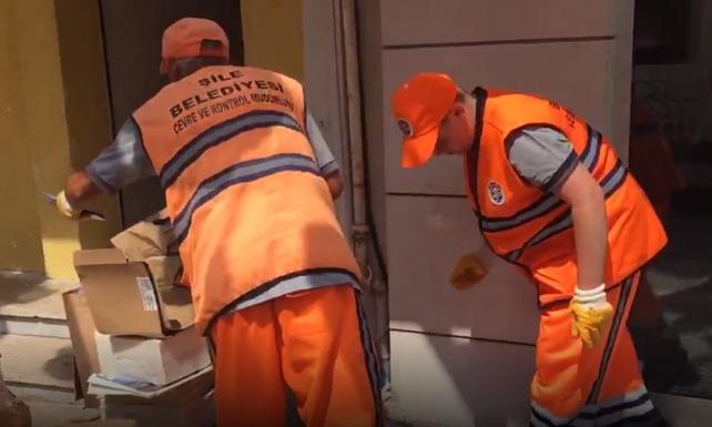 CHP’li Tanal’ın çektiği görüntülerde, 2 belediye işçisi, AKP ilçe binası önünde yere saçılan broşürleri toplayıp kolilere istiflerken görülüyor.
