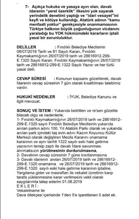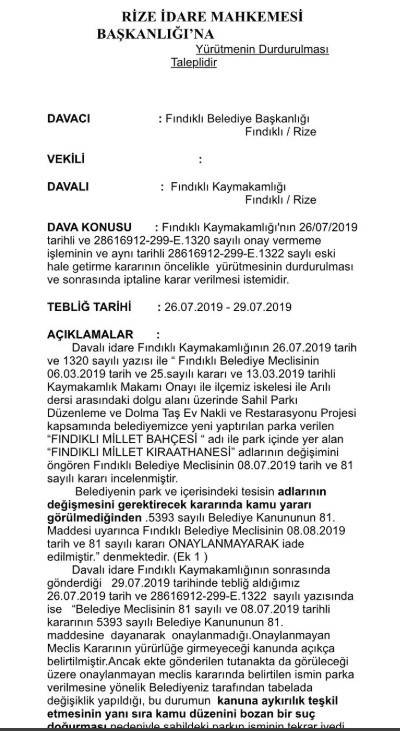 Fındıklı Belediyesi, dava dilekçesinde, "Açıkça hukuka ve yasaya aykırı olan, davalı idarenin 'yerel özerklik' ilkesini yok sayarak yerindelik denetimi yaptığı ve 'idari vesayet'ini keyfi ve kötüye kullandığı, Atatürk adının 'kamu menfaati yoktur' gerekçesiyle onanmamasının Türkiye halkının büyük çoğunluğunun vicdanını yaraladığı bu yok hükmündeki kararların iptali yasal zorunluluktur" ifadesi kullanıldı.