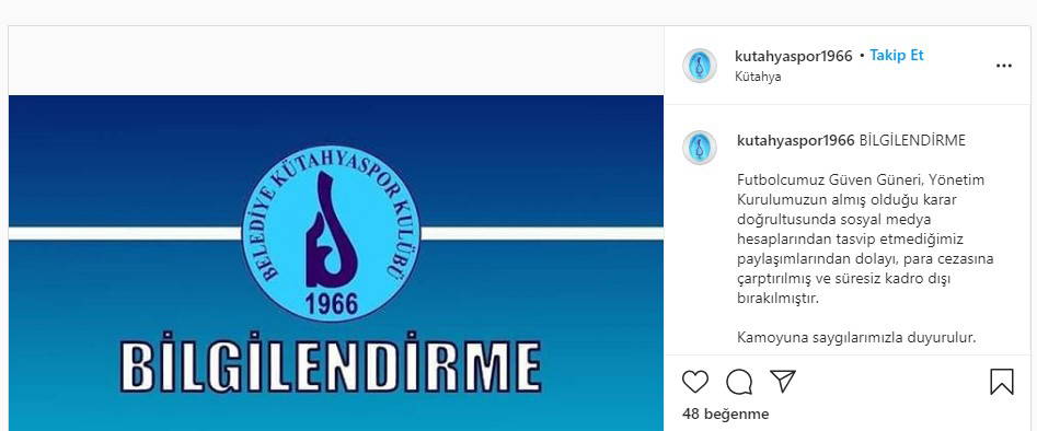 Konuyla ilgili bir açıklama yapan Belediye Kütahyaspor, "Futbolcumuz Güven Güneri, Yönetim Kurulumuzun almış olduğu karar doğrultusunda sosyal medya hesaplarından tasvip etmediğimiz paylaşımlarından dolayı, para cezasına çarptırılmış ve süresiz kadro dışı bırakılmıştır. Kamoyuna saygılarımızla duyurulur" ifadesi kullanıldı.