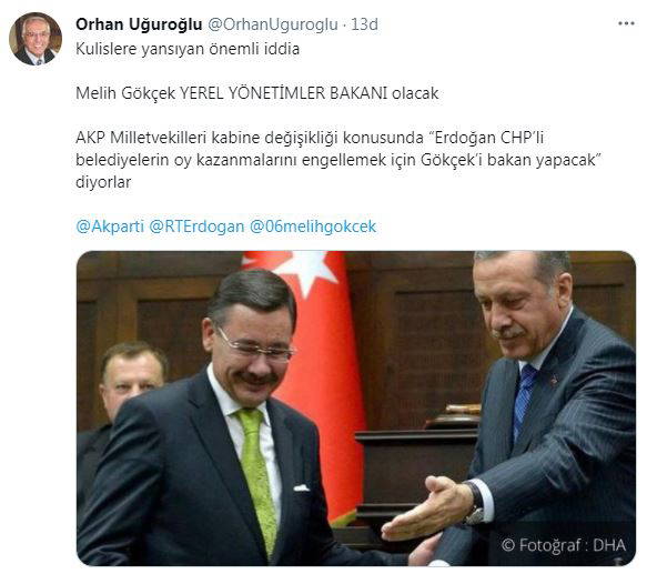 "Kulislere yansıyan önemli iddia Melih Gökçek Yerel Yönetimler Bakanı olacak AKP milletvekilleri kabine değişikliği konusunda 'Erdoğan CHP’li belediyelerin oy kazanmalarını engellemek için Gökçek’i bakan yapacak' diyorlar. "