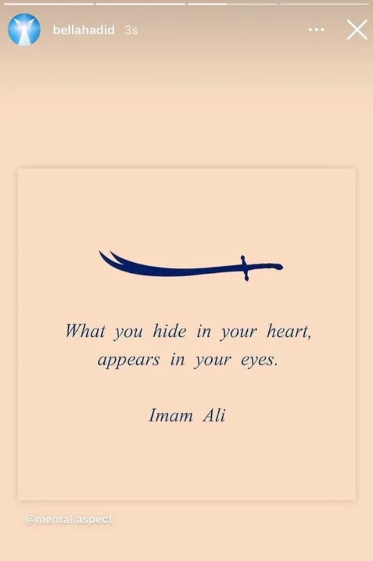 Ünlü model Bella Hadid, son olarak sosyal medya hesabından yaptığı Hz. Ali paylaşımı ile gündeme oturdu. Instagram'dan Zülfikar kılıçlı bir paylaşım yapan ünlü model, Hz. Ali'nin “Kalbinde sakladıkların gözlerinde belirir” sözüne yer verdi.