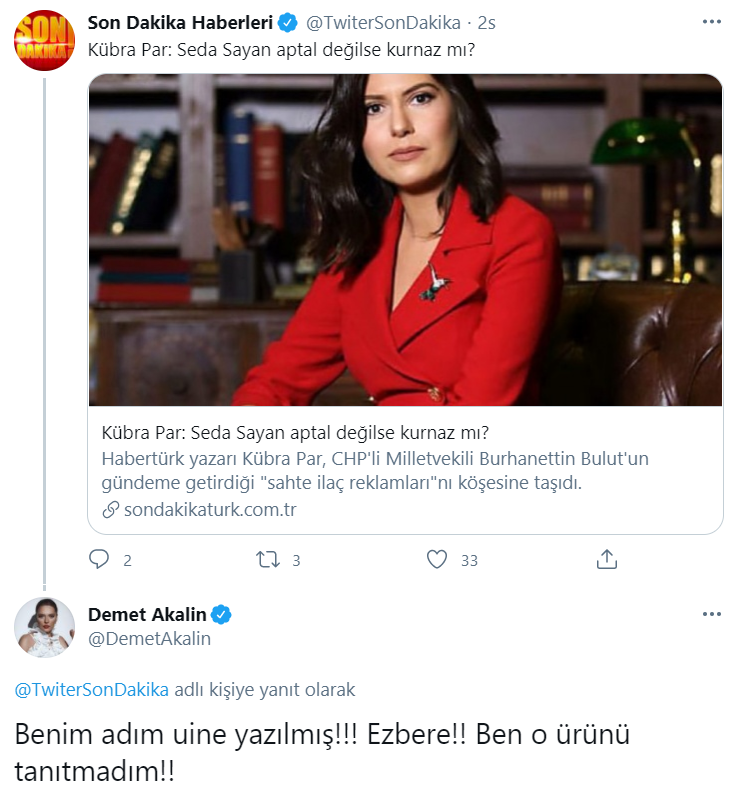 Kübra Par’ın, yazısının Twitter’daki paylaşımını yanıtlayan Demet Akalın, adının Demet Şener ile karıştırıldığını, kendisinin ilaç ürünü tanıtmadığını belirtti.
