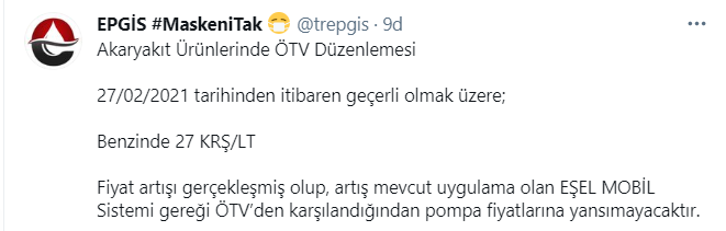 Enerji Petrol Gaz İkmal İstasyonları İşveren Sendikası'ndan (EPGİS) alınan bilgiye göre 27 Şubat 2021 tarihinden itibaren geçerli olmak üzere benzinde 27 kuruş zam yapıldı.