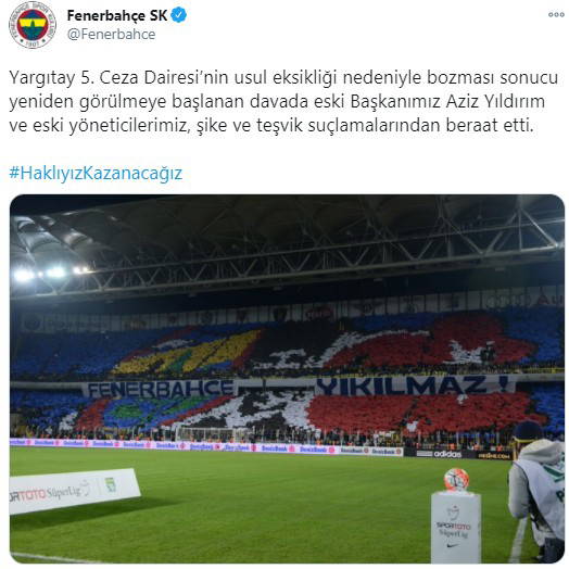 Beraat sonrası Fenerbahçe'den "Haklıyız kazanacağız" paylaşımı