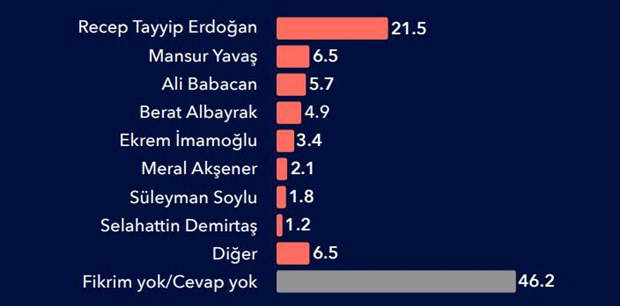 Ankete göre, ülke ekonomisini en iyi yönetecek isim ise yıllardır yönetimde olan AKP’li Cumhurbaşkanı Recep Tayyip Erdoğan oldu.