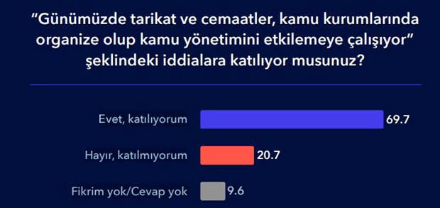 Katılımcıların yüzde 70’i “Günümüzde tarikat ve cemaatler, kamu kurumlarında organize olup kamu yönetimini etkilemeye çalışıyor” dedi.