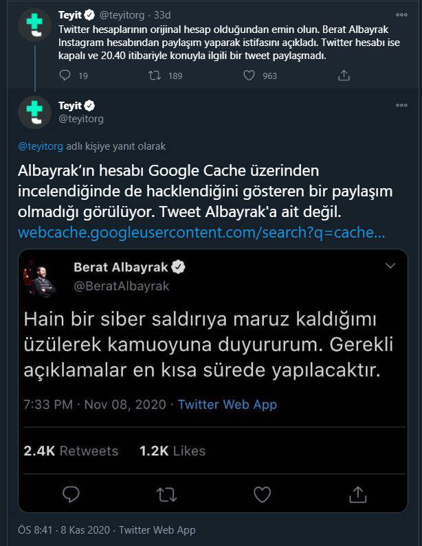 "Albayrak’ın hesabı Google Cache üzerinden incelendiğinde de hacklendiğini gösteren bir paylaşım olmadığı görülüyor. Tweet Albayrak'a ait değil."