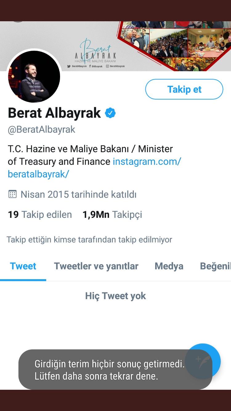 Hesabın kapatılmadan önce Berat Albayrak'ın Hazine ve Maliye Bakanlığı gibi tüm tweetlerinin silindiği ortaya çıktı.