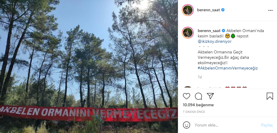 Ünlü oyuncu, paylaşımına, "Akbelen Ormani’nda kesim basladi!" notunu düştü.