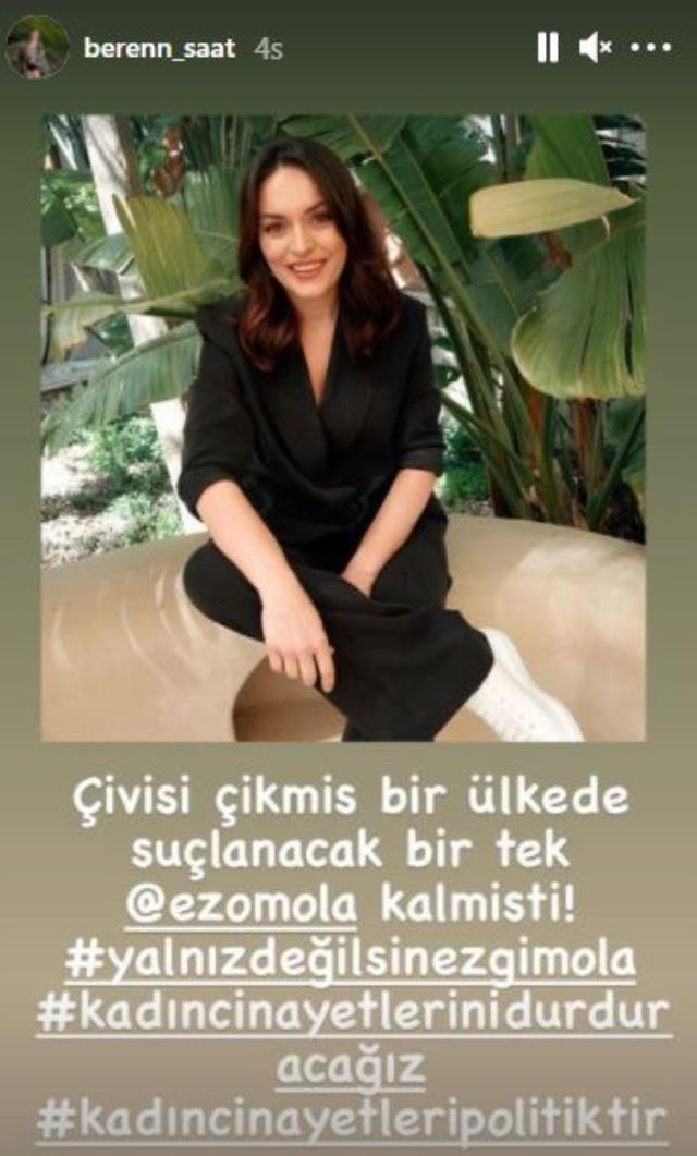 Ezgi Mola'ya sosyal medyadan destek mesajları atılmaya devam ederken, bir destek de meslektaşı Beren Saat'ten geldi. Son olarak Beren Saat, Mola'nın karesini Instagram'dan paylaşıp, "Çivisi çıkmış bir ülkede suçlanacak bir tek Ezgi Mola kalmıştı. Yalnız değilsin Ezgi Mola" diye yazdı.