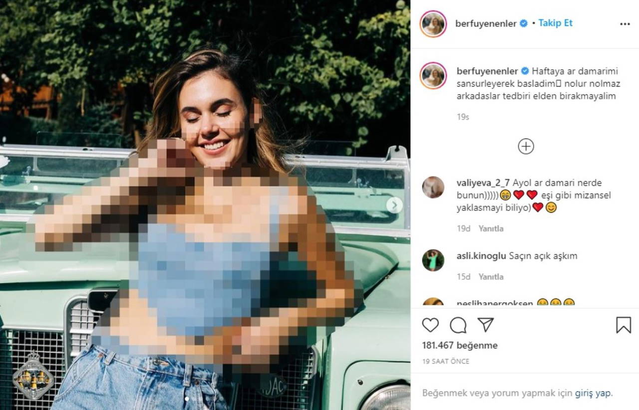 Berfu Yenenler, paylaşımına, "Haftaya ar damarımı sansürleyerek başladım. Ne olur ne olmaz arkadaşlar tedbiri elden bırakmayalım" notunu düştü.