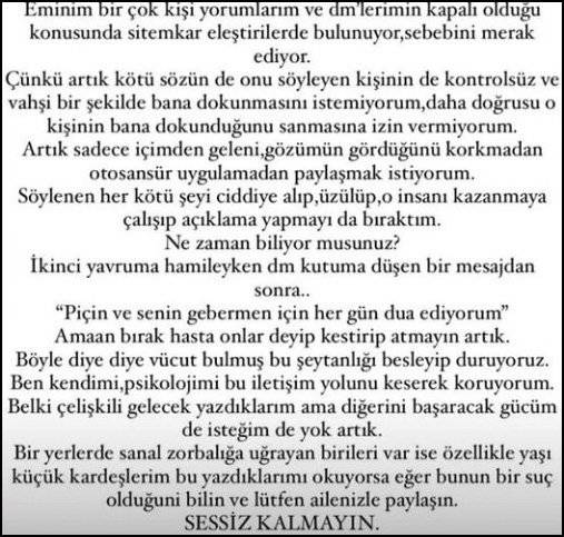 Bir yerlerde sanal zorbalığa uğrayan birileri var ise özellikle yaşı küçük kardeşlerim bu yazdıklarımı okuyorsa eğer bunun bir suç olduğunu bilin ve lütfen ailenizle paylaşın. Sessiz kalmayın!"