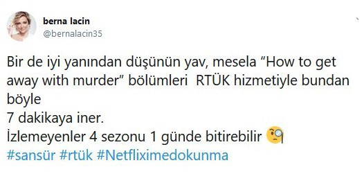 "Bir de iyi yanından düşünün yav, mesela “How to get away with murder” bölümleri RTÜK hizmetiyle bundan böyle 7 dakikaya iner. İzlemeyenler 4 sezonu 1 günde bitirebilir"