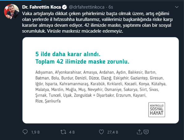Böylece 42 ilde (Adıyaman, Afyonkarahisar, Amasya, Ardahan, Aydın, Balıkesir, Bartın, Batman, Bolu, Burdur, Denizli, Düzce, Elazığ, Eskişehir, Gaziantep, Giresun, Iğdır, Isparta, Kahramanmaraş, Karabük, Kırklareli, Kocaeli, Konya, Kütahya, Malatya, Mardin, Muğla, Muş, Nevşehir, Osmaniye, Sakarya, Siirt, Sivas, Şırnak, Tunceli, Uşak, Zonguldak, Diyarbakır, Erzurum, Kayseri, Rize ve Şanlıurfa) maske kullanımı zorunlu hale getirildi.