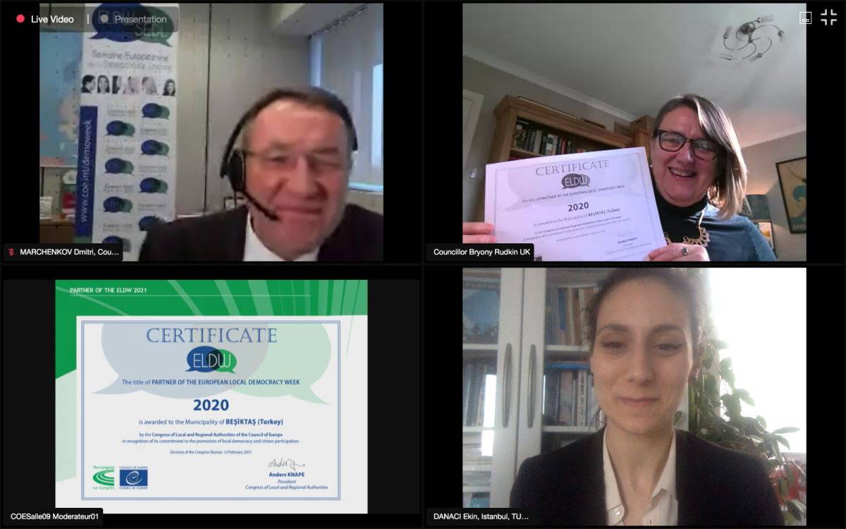 Beşiktaş Belediyesi sunumunu, Dış İlişkiler Müdürlüğü Proje Koordinatörü F. Ekin DANACI İngilizce olarak yaptı. Sunumların bitimiyle, sanal olarak her bir belediye adına hazırlanan sertifikalar tek tek belediye temsilcilerine bağlanılarak takdim edildi. Online ödüller Birleşik Krallık İngiltere'den Avrupa Konseyi Üyesi ve ELDW temsilcisi olan toplantı başkanı Bryony Rudkin ve İşbirliği Birimi ve Dış İlişkiler Daire Başkanı Dmitri Marchenkov tarafından verildi.
