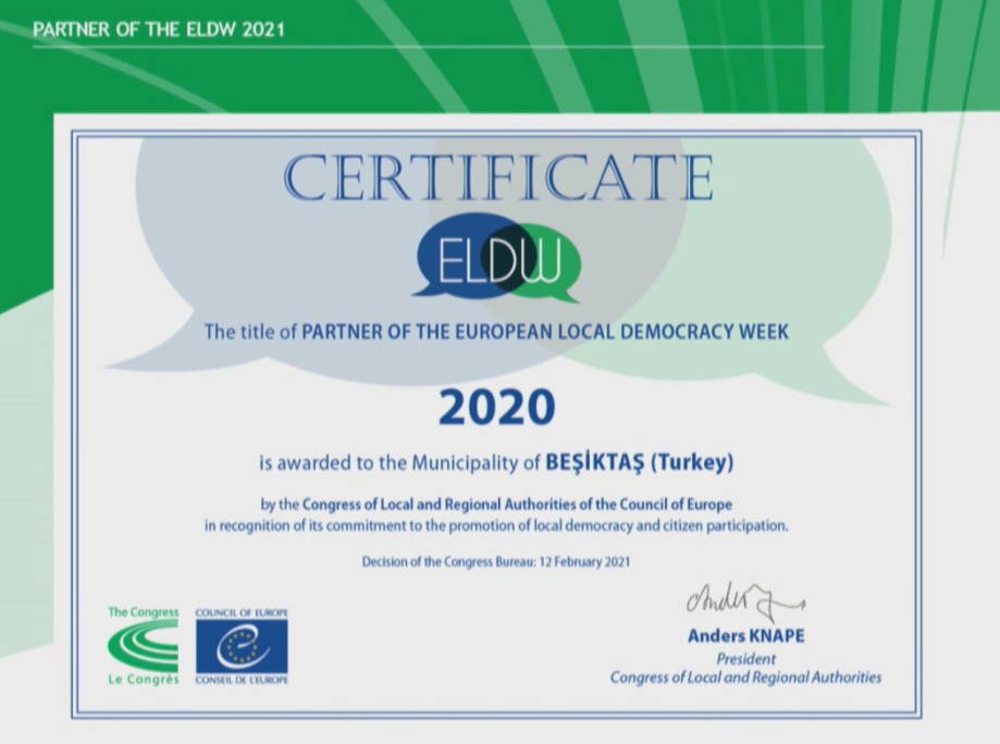 Beşiktaş Belediyesi, Avrupa Konseyi tarafından koordine edilen Avrupa Yerel Demokrasi Haftası (European Local Democracy Week - ELDW) kapsamında 2020 Avrupa Demokrasi Haftası Partneri unvanını aldı. Beşiktaş Belediyesi’nin bu unvanı almasında 2020 yılında gerçekleştirdiği; ‘Halk Sağlığı Dijital Yönetim Merkezi’, ‘Online Tıbbi Danışma Hizmeti’, ‘Atık Maske ve Eldiven Kutuları’, ‘Dayanışma Askısı’, ‘Eşitlik Evde Başlar Kampanyası’, ‘Beşiktaş Belediyesi Kadın Cinayetlerine ve İstanbul Sözleşmesi'ne Dikkat Çekiyor Kampanyası’, ‘Modüler Kent Parkı Barbaros Meydanı’nda’, ‘Stresle Topyekûn Mücadele Hareketi’ gibi çalışmaları etkili oldu.