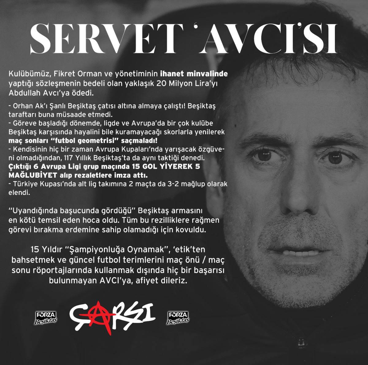 Beşiktaş Kulübü'nün, teknik direktör Abdullah Avcı'ya 20 milyon 12 bin 192 lira sözleşme fesih tazminatı ödemesinin ardından Çarşı Grubu bir açıklama yaptı.