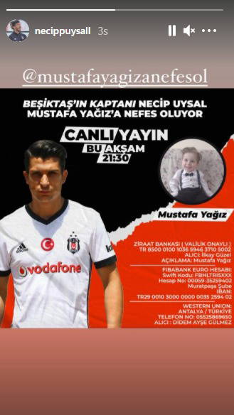 Beşiktaşlı Necip Uysal ve Cenk Tosun Instagram'da ortak bir yayın açarak SMA hastası Mustafa Yağız için yardım topladılar.