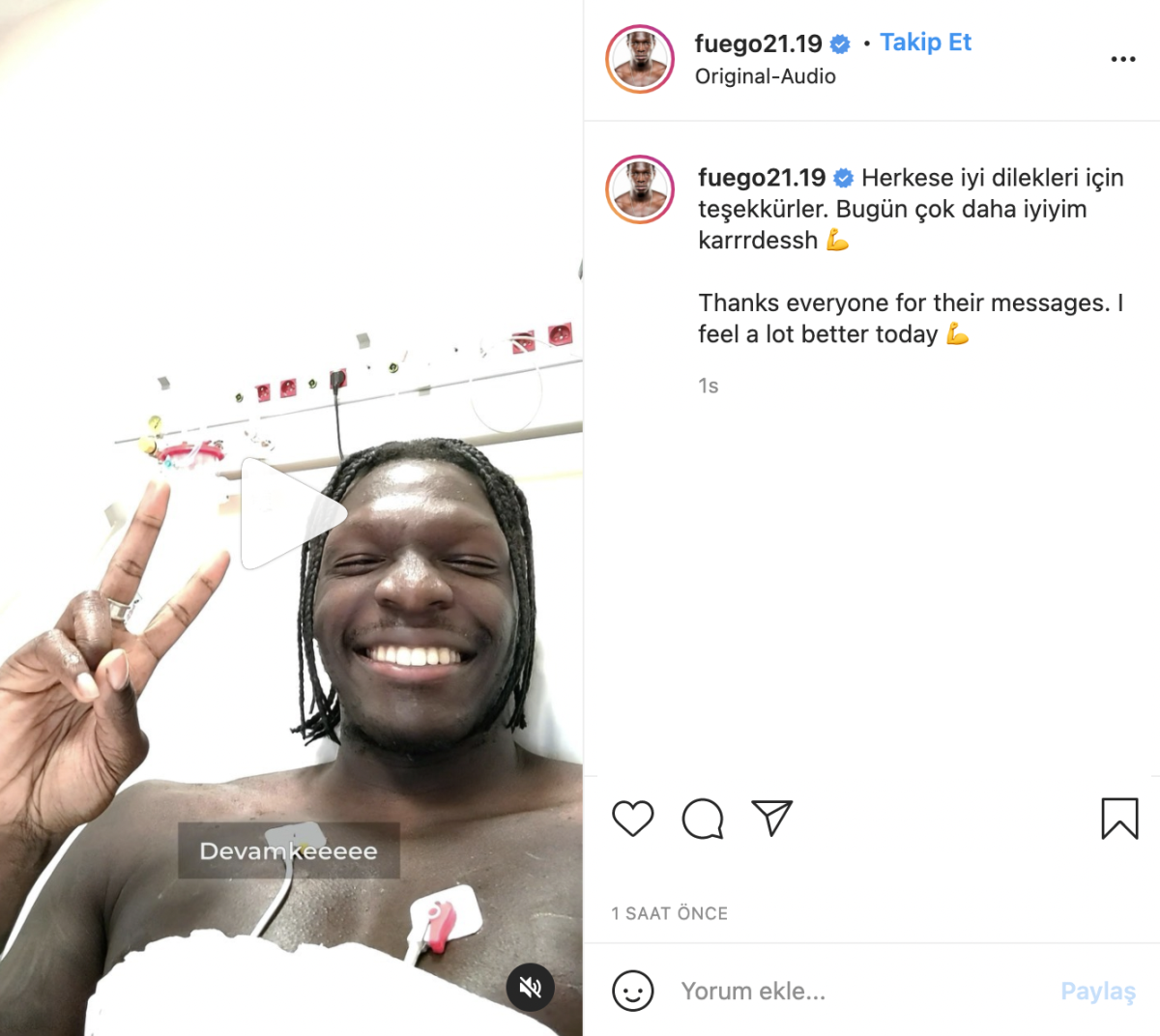 "Selamlar kardeşler. Mesajlarınız ve iyi dilekleriniz için çok teşekkür ederim. Zor bir andı hepimiz için. Tekrardan teşekkür ederim, kendimi bugün çok daha iyi hissediyorum. Antrenmana bile başlayabilecek kadar iyi hissediyorum. Bakalım, yakında geri döneceğim. Görüşürüz, devamke."