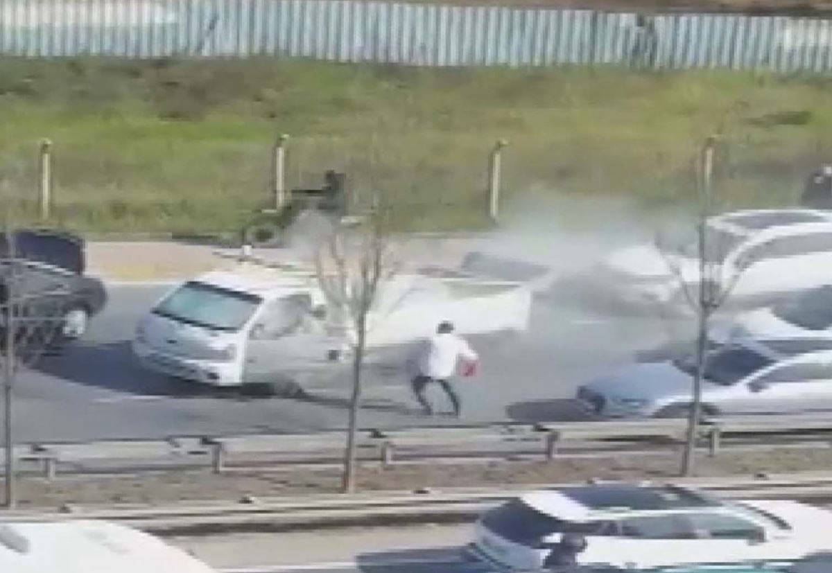 Otomobilin sürücüsü, yangın söndürme tüpünü kamyonet sürücüsünün üzerine boşalttı. Araçlarını yolun ortasında durdurdukları için bir anda arkalarından trafik yoğunluğu oluştu.