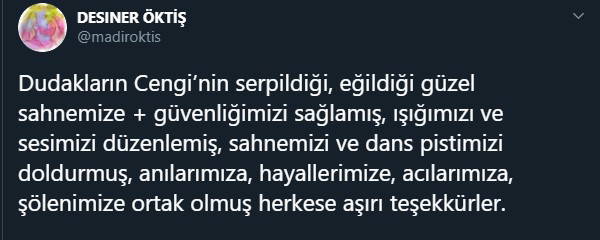 "Kötü bi haberim var: Anahit Sahne’nin kapanmış olduğunu benden duyun isterim. Dudakların Cengi’nin serpildiği, eğildiği güzel sahnemize + güvenliğimizi sağlamış, ışığımızı ve sesimizi düzenlemiş, sahnemizi ve dans pistimizi doldurmuş, anılarımıza, hayallerimize, acılarımıza, şölenimize ortak olmuş herkese aşırı teşekkürler."