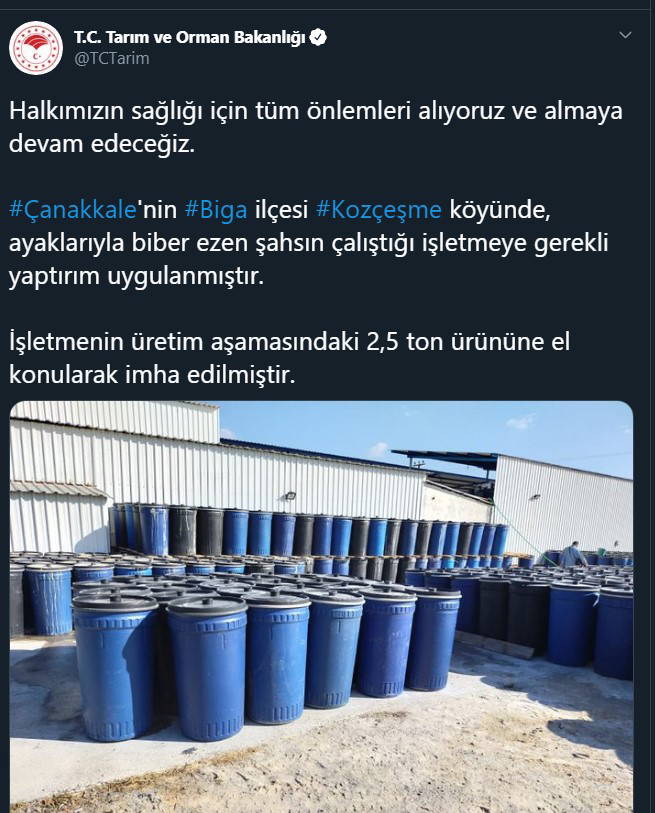 Bakanlığın Twitter hesabından yapılan açıklamada, "Halkımızın sağlığı için tüm önlemleri alıyoruz ve almaya devam edeceğiz. Çanakkale'nin Biga ilçesi Kozçeşme köyünde, ayaklarıyla biber ezen şahsın çalıştığı işletmeye gerekli yaptırım uygulanmıştır. İşletmenin üretim aşamasındaki 2,5 ton ürününe el konularak imha edilmiştir" denildi.