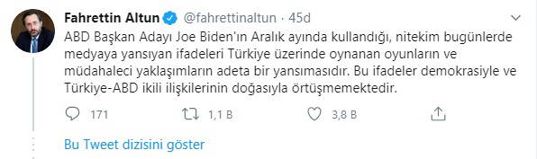 "ABD Başkan Adayı Joe Biden'ın Aralık ayında kullandığı, nitekim bugünlerde medyaya yansıyan ifadeleri Türkiye üzerinde oynanan oyunların ve müdahaleci yaklaşımların adeta bir yansımasıdır. Bu ifadeler demokrasiyle ve Türkiye-ABD ikili ilişkilerinin doğasıyla örtüşmemektedir" dedi.