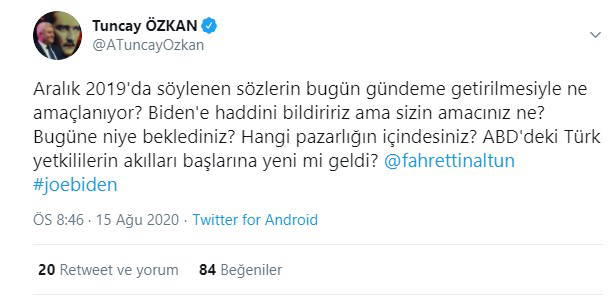 "Aralık 2019'da söylenen sözlerin bugün gündeme getirilmesiyle ne amaçlanıyor? Biden'e haddini bildiririz ama sizin amacınız ne? Bugüne niye beklediniz? Hangi pazarlığın içindesiniz? ABD'deki Türk yetkililerin akılları başlarına yeni mi geldi?"