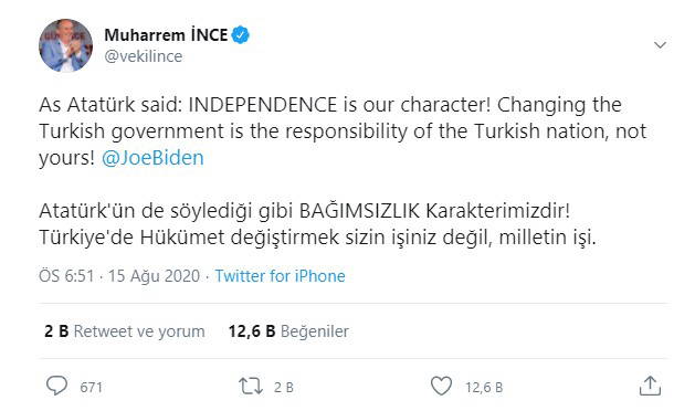 CHP'den ayrılacağı konuşulan Muharrem İnce, Biden'e tepki gösterdiği sözlerinde, "Atatürk'ün de söylediği gibi bağımsızlık karakterimizdir! Türkiye'de Hükümet değiştirmek sizin işiniz değil, milletin işi" dedi.