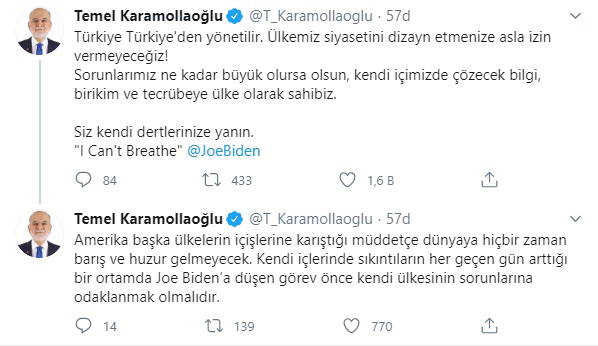 Saadet Partisi Genel Başkanı Temel Karamollaoğlu ise konuya ilişkin yaptığı açıklamada, ""Türkiye Türkiye'den yönetilir. Ülkemiz siyasetini dizayn etmenize asla izin vermeyeceğiz! Sorunlarımız ne kadar büyük olursa olsun, kendi içimizde çözecek bilgi, birikim ve tecrübeye ülke olarak sahibiz. Siz kendi dertlerinize yanın. "I Can't Breathe" dedi."