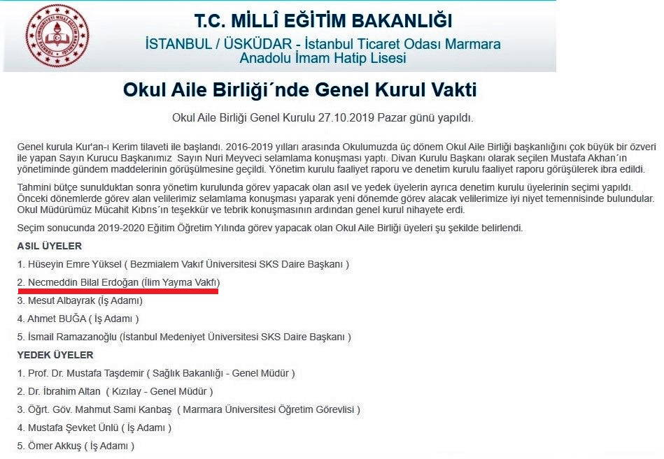 Yine internet bilgilerine göre, lisenin, 5 kişilik “Okul Aile Birliği” yönetim kurulu üyeleri arasında Cumhurbaşkanı Erdoğan'ın oğlu Bilal Erdoğan da (İlim Yayma Vakfı) bulunuyor.