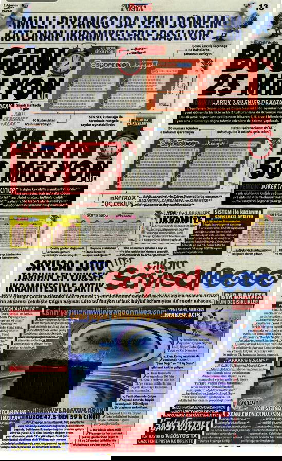 Her üç gazetede de bir tam sayfa Milli Piyango, Sayısal Loto, Süper Loto ’daki değişikliklere ayrılmıştı. Üçü de de tamamen aynıydı bu sayfaların. Reklam sayfasıydı bunlar ama sağında solunda da “Bu bir reklam sayfasıdır” diye hiçbir uyarı yoktu.