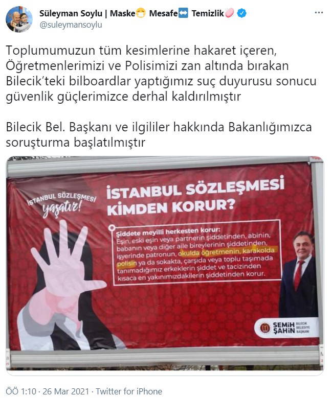 Bakan Soylu, Twitter hesabından yaptığı açıklamada "Toplumumuzun tüm kesimlerine hakaret içeren, Öğretmenlerimizi ve Polisimizi zan altında bırakan Bilecik'teki bilboardlar yaptığımız suç duyurusu sonucu güvenlik güçlerimizce derhal kaldırılmıştır. Bilecik Belediye Başkanı ve ilgililer hakkında Bakanlığımızca soruşturma başlatılmıştır." ifadelerini kaydetti.