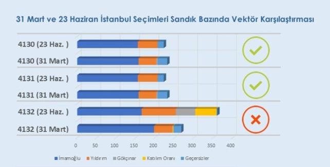 Diğer bir örnek olarak, seçim gecesi olası yanlış veri girişlerini (hem YSK tarafında oluşacak hem de muhalefetin örgüt elemanlarının kendi sistemlerine veri girerken yapacağı yanlışları) erkenden belirleyebilecek bir uyarı mekanizması kurulabilir. Örneğin aşağıdaki grafikte görsel olarak verilen örnekte 4132 numaralı sandık için olan sonuçların önemli ölçüde farklılık gösterdiği belirgin bir şekilde görülmektedir.