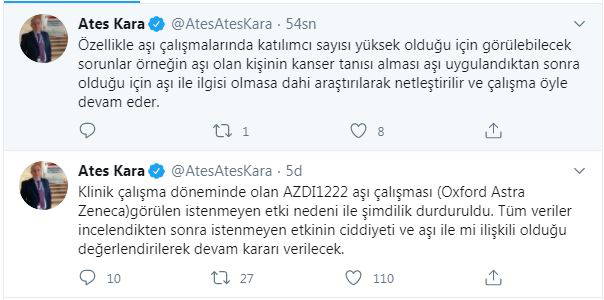 Prof. Dr. Ateş Kara, Twitter'daki hesabından İngiltere'de Oxford Üniversitesi Jenner Enstitüsü ile Oxford Aşı Grubu iş birliğinde geliştirilen ve üretim lisansı İngiliz-İsveç ilaç şirketi AstraZeneca tarafından satın alınan 'AZD1222' adlı aşıya ilişkin açıklama yaptı.