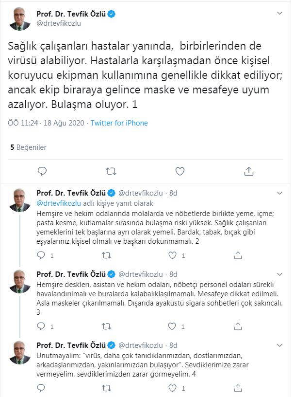 Sağlık Bakanlığı Koronavirüs Bilim Kurulu üyesi ve Karadeniz Teknik Üniversitesi Farabi Hastanesi Göğüs Hastalıkları Uzmanı Prof. Dr. Özlü, sosyal paylaşım sitesi Twitter hesabından yaptığı açıklamada, sağlık çalışanlarının hastaların yanı sıra birbirlerinden de koronavirüs alabildiklerini belirtti. Prof. Dr. Özlü, "Hastalarla karşılaşmadan önce kişisel koruyucu ekipman kullanımına genellikle dikkat ediliyor; ancak ekip bir araya gelince maske ve mesafeye uyum azalıyor. Bulaşma oluyor" dedi.