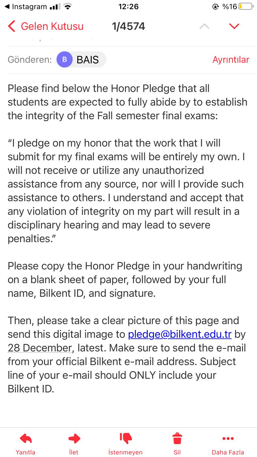 Ankara'da İhsan Doğramacı Bilkent Üniversitesi, online yapılacak final sınavlarında kopya çekilmesine karşı “onur yemini” edilmesini istedi. Öğrencilere gönderilen mesajda, boş bir kağıda el yazısıyla kopya çekmeyeceklerine dair “onur yemini” yazıp, öğrenci numaraları ve imzalarıyla üniversiteye mail atmaları gerektiğini bildirdi. Üniversitenin yazılmasını istediği “onur yemini” metni şöyle:
