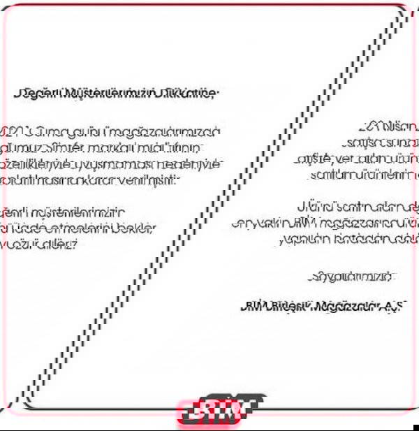 Açıklamada, ''23 Nisan 2021 Cuma günü mağazalarımızda satışa sunduğumuz Simfer markalı midi fırının afişte yer alan ürün özellikleriyle uyuşmaması nedeniyle satılan ürünlerin toplatılmasına karar verilmiştir. Ürünü satın alan müşterilerimizin en yakın BİM mağazasına iade etmelerini bekler, yapılan hatadan dolayı özür dileriz'' denildi.