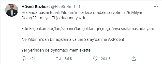 Hollanda basınında AKP’li Binali Yıldırım 150 milyon dolar değerinde bir şirketinin olduğu duyurulmuştu. CHP'li eski Milletvekili Hüsnü Bozkurt, sosyal medya hesabından şirketin değerinin 26 milyar dolara çıktığını iddia ederek "Eski Başbakan Koç’ları, Sabancı’ları çoktan geçmiş, dünya sıralamasında yani" ifadelerini kullandı.