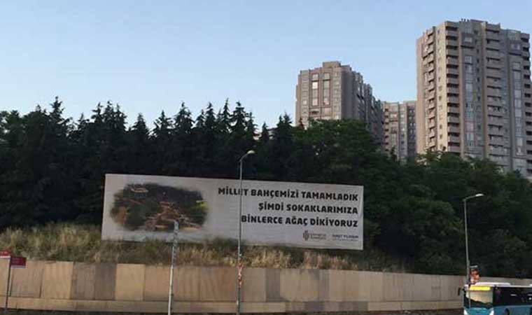 Önünde Ümraniye Belediyesi'ne ait “Millet bahçemizi tamamladık, şimdi sokaklarımıza binlerce ağaç dikiyoruz” tabelasının da yer aldığı arazideki ağaç kıyımına bölgede yaşayan vatandaşlar tepki gösterdi.