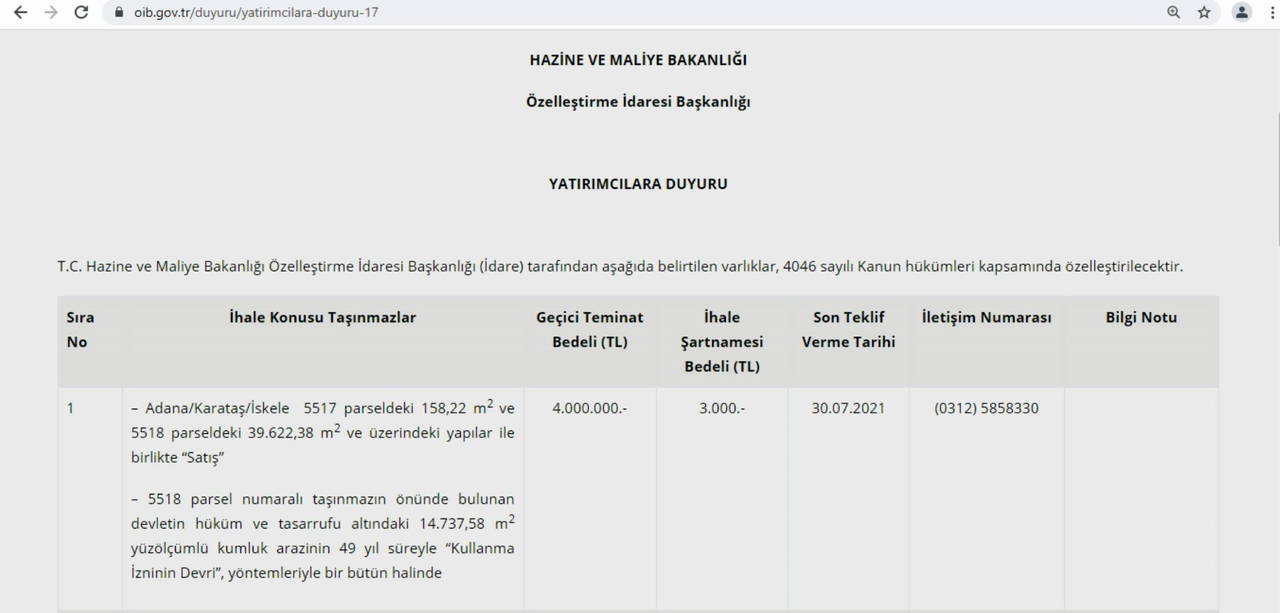 Hazine ve Maliye Bakanlığı Özelleştirme İdaresi Başkanlığı, 4046 Sayılı Kanun hükümleri kapsamında Adana'nın Karataş İlçesi'ne bağlı İskele Mahallesi'nde bulunan 5517 parseldeki 158.22 metrekarelik alan ve 5518 parseldeki 39 bin 622 metrekarelik alanı üzerindeki yapılar ile birlikte 4 milyon lira geçici teminat bedeliyle satışa çıkardı.