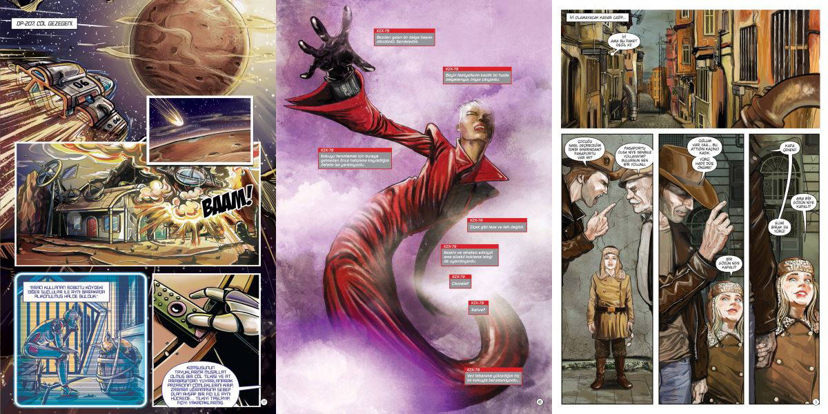 Bu sayede, yapıt kapsamında görev alan sanatçılar çoğu zaman sayfa sayısının yarattığı tuzağa düşmemiş oluyor. Üstelik, bu kısa tanıtımlardan de biraz göreceğiniz gibi, bilim kurgu türü etrafında bir araya getirilmiş bir sayı olması, çizgi roman içinde çeşitlilik açısından bir eksiklik olduğu anlamına da gelmiyor:
