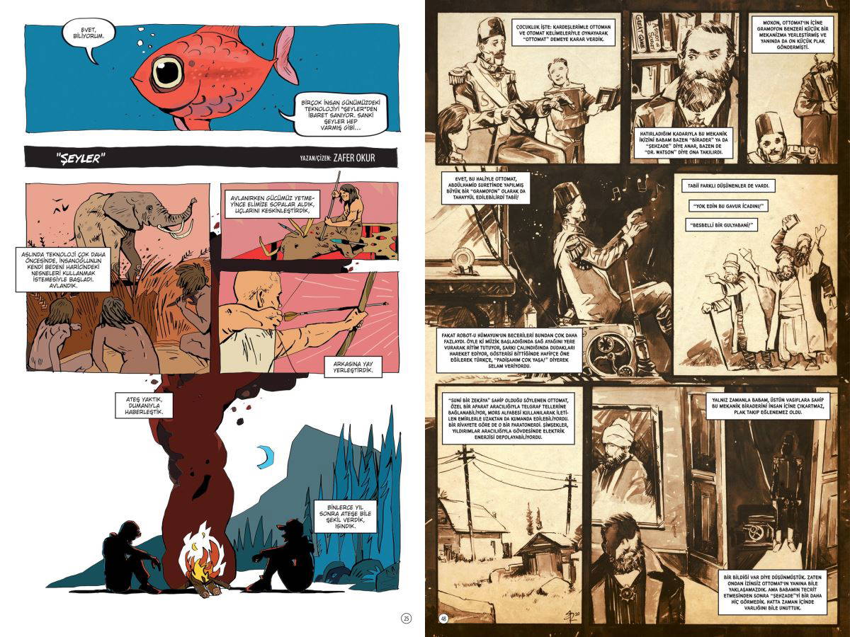 Teknoloji bağımlığının apayrı bir boyuta ulaştığı “Şeyler” hikayesinden, II. Abdülhamid döneminde tuhaf ve komik bir bilim kurgu hikâyesi anlatan “Ottomat”a; kadına karşı şiddet konusunda ciddi toplumsal eleştiriler içeren “Sırat”tan, bilim kurgunun klasik temalarından biri olan robot - insan ilişkisini farklı örnekler çerçevesinde el alan “Bilişsel Düşüşler Hiyerarşisi”ne kadar; çizgi roman içindeki pek çok hikaye daha basit, daha “fikir” odaklı anlatılar içeriyor.