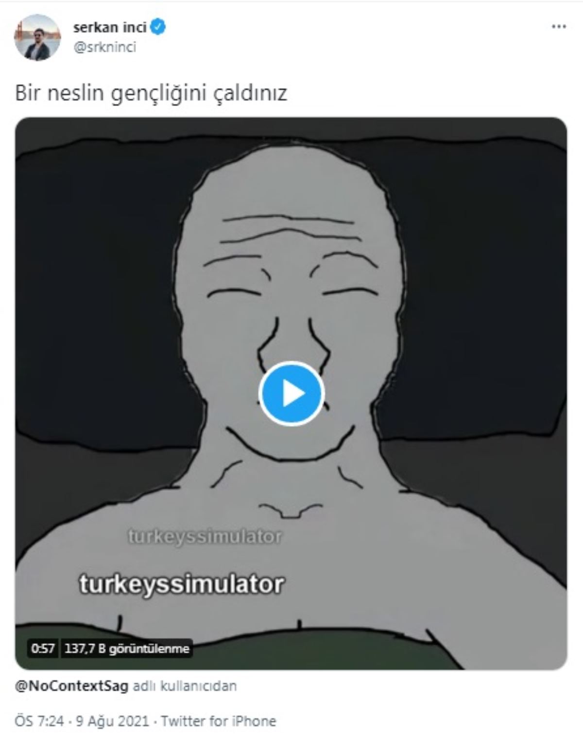 Serkan İnci, Twitter hesabından bir süredir iktidara yönelik eleştirel paylaşımlarda bulunuyordu. İnci bu kez ise AKP iktidarı döneminde yaşanan skandalların ve felaketlerin yer aldığı, gençliğin göz bir videoyu paylaşarak "Bir neslin geleceğini çaldınız" ifadelerini kullandı.